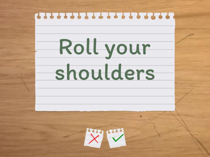 Raise your arms and stretch, Breathe in, Exhale, inhale, breathe in and out, Roll your shoulders, roll your neck, Put your arms up, Make circles with your arms, Cross your arms, Stand on your toes, twist five times, Balance on your left foot and then right foot,