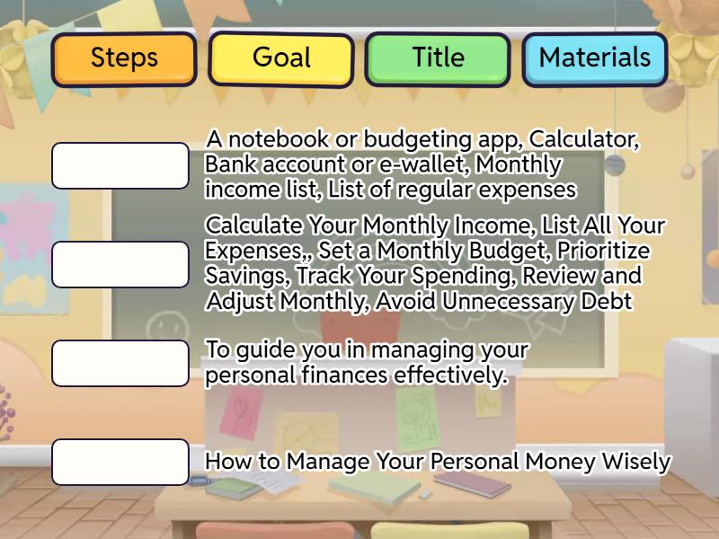 Title - How to Manage Your Personal Money Wisely, Goal - To guide you in managing your personal finances effectively., Materials - A notebook or budgeting app, Calculator, Bank account or e-wallet, Monthly income list, List of regular expenses, Steps - Calculate Your Monthly Income, List All Your Expenses,, Set a Monthly Budget, Prioritize Savings, Track Your Spending, Review and Adjust Monthly, Avoid Unnecessary Debt,