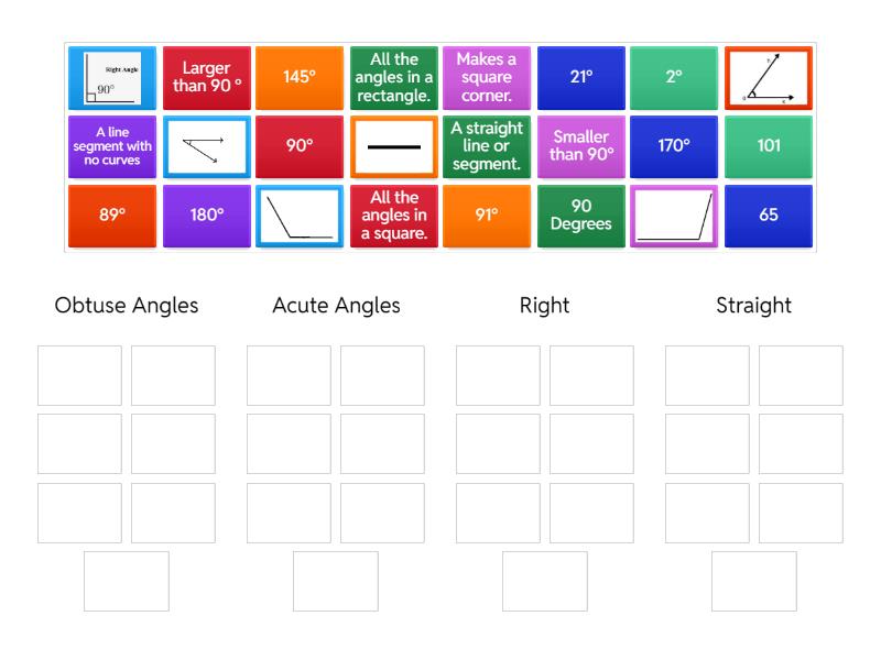Obtuse Angles: Larger than 90 °, 170°, , 91°, , 145°, 101, Acute Angles: Smaller than 90°, 89°, , 2°, , 21°, 65, Right: Makes a square corner., 90°, , All the angles in a square., 90 Degrees, All the angles in a rectangle., Straight: A straight line or segment., 180°, , A line segment with no curves,