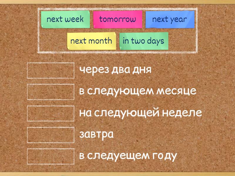 tomorrow - завтра, next week - на следующей неделе, next month - в следующем месяце, next year - в следуещем году, in two days - через два дня,