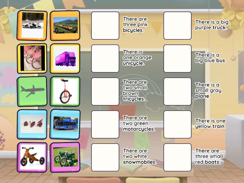 There is a big blue bus., There are three small red boats., There is one yellow train., There are two white snowmobiles., There is a small gray plane., There are two green motorcycles., There is one orange unicycle., There are three pink bicycles., There is a big purple truck., There are two small brown tricycles.,
