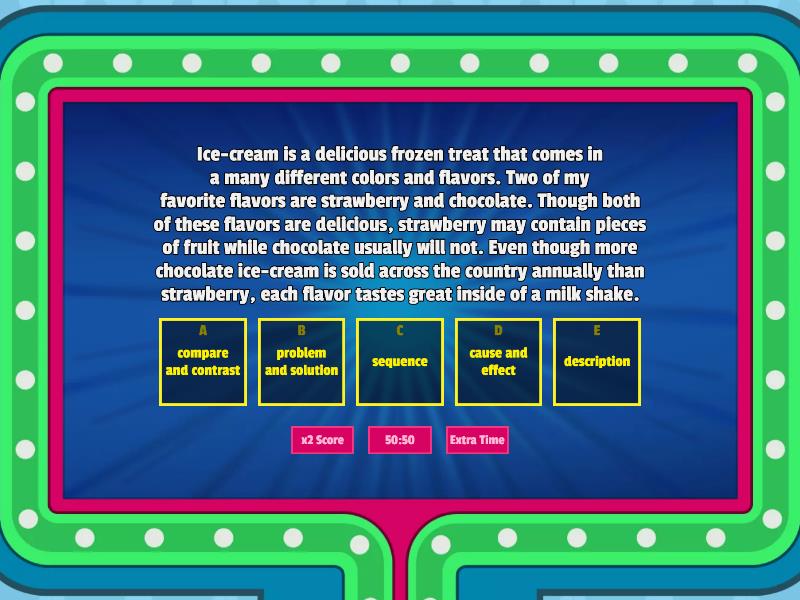 1) Ice-cream is a delicious frozen treat that comes in a many different colors and flavors. Two of my favorite flavors are strawberry and chocolate. Though both of these flavors are delicious, strawberry may contain pieces of fruit while chocolate usually will not. Even though more chocolate ice-cream is sold across the country annually than strawberry, each flavor tastes great inside of a milk shake. a) compare and contrast b) problem and solution c) sequence d) cause and effect e) description 2) Rainforests are rapidly disappearing. About 40% of the world's rainforests have already been destroyed. This problem has led environmentalists to do everything that they can to help conserve this important biome. One way to help the rainforest is to plant trees on land where forests have been cut down. Another way to help is to encourage people to live in a way that does not hurt the environment. a) compare and contrast b) problem and solution c) sequence d) cause and effect e) description 3) The authors explain how things happen in order. What text structure is this? a) compare and contrast b) problem and solution c) sequence d) none of the choices e) cause and effect f) description 4) Suppose an author wanted to explain how these two birds are similar and different. What text structure is this? a) compare and contrast b) problem and solution c) sequence d) cause and effect e) description 5) Many places are creating large amounts of waste, and certain areas where it is stored are running out of room. This ongoing issue can harm nature and take up space that could be used for other things. To help fix the problem, people are finding new ways to use items again or turn them into something else. For example, some towns are using food leftovers in helpful ways, and others are using fewer throwaway items. a) compare and contrast b) problem and solution c) sequence d) cause and effect e) description 6) Suppose the author gave you a reason/explanation for happening. What text structure is it? a) compare and contrast b) problem and solution c) sequence d) cause and effect e) description 7) Coral reefs are in danger and are slowly being destroyed. Coral reefs grow at a very slow rate and therefore are disintegrating faster than they can grow. There are many reasons coral reefs are being destroyed, and most of the damage is caused by humans, mostly from pollution, overfishing, and people touching the reefs or hitting them with their boats. Warmer ocean temperatures caused by climate change are also stressing the reefs, making them weaker and more likely to die. Without action, many coral reefs may disappear completely, affecting the ocean animals that depend on them for food and shelter. a) compare and contrast b) problem and solution c) sequence d) cause and effect e) description 8) One time my mom and I made ice-cream. We added sugar and cream into a big glass bowl. We added sugar and cream into a big bowl. We kept it frozen in the middle of a bigger glass bowl. While it froze, I stirred the mixture with a hand mixer. It was the first time that I had used one and it splattered ice-cream mixture all over the kitchen. The rest of the mixture finally froze, so we ate some ice cream, and then put the remaining portions in the freezer so that it wouldn't get freezer burned. That was a good day. a) compare and contrast b) problem and solution c) sequence d) cause and effect e) description 9) Though toads are still around, they no longer are as common in some areas as they were a few decades ago. The growing use of insecticides has reduced their numbers. The chemical sprays usually do not harm toads, but cut down the animals’ food supply. Thereby, the toads do not have enough food to survive. There are fewer toads in many areas populated by humans. a) compare and contrast b) problem and solution c) sequence d) cause and effect e) description 10) A lot of students have been failing classes. These students wouldn’t be failing classes if they studied more, asked questions, tried harder, and came in for extra help. Even though a lot of students fail classes, they have many options if they want to pass. a) compare and contrast b) problem and solution c) sequence d) cause and effect e) description 11) There are two popular sports played at Ericson, basketball and volleyball. Both take place inside of the gym at Ericson. Also, each sport has two teams of people. In basketball, however, the ball can be played off of the floor, and in volleyball, the ball cannot touch the floor or it is out of play. Basketball and volleyball are popular sports at Ericson. a) compare and contrast b) problem and solution c) sequence d) cause and effect e) description 12) When Tim woke up, he didn’t want to go to school. His mom took him anyway. So, he went to school, but he didn’t do any work. The days passed, and Tim still didn’t do any work. Mr. Morton called Tim’s house, but Tim still wouldn’t do any work. Finally the report cards came out, and Tim failed his classes. Tim was sad. a) compare and contrast b) problem and solution c) sequence d) none on the list e) cause and effect f) description