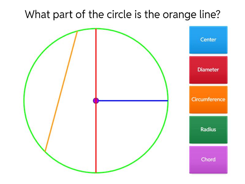 1) What part of the circle is the orange line? a) Center b) Diameter c) Circumference d) Radius e) Chord 2) What part of the circle is the blue line? a) Radius b) Center c) Diameter d) Circumference e) Chord 3) Choose all parts of a circle that describe the red line. a) Radius b) Diameter c) Chord d) Circumference 4) The center dot represents what? a) Radius b) Center c) Diameter d) Chord