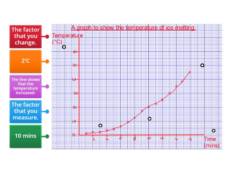 The factor that you measure., The factor that you change., 2'C, 10 mins, The line shows that the temperature increased..
