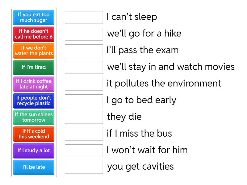 If I study a lot - I’ll pass the exam, I’ll be late - if I miss the bus, If I’m tired - I go to bed early, If people don’t recycle plastic - it pollutes the environment, If the sun shines tomorrow - we’ll go for a hike, If you eat too much sugar - you get cavities, If it’s cold this weekend - we’ll stay in and watch movies, If he doesn’t call me before 6 - I won’t wait for him, If we don't water the plants - they die, If I drink coffee late at night - I can’t sleep,
