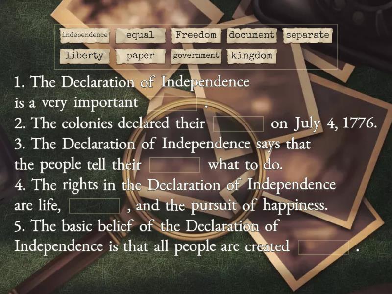 1. The Declaration of Independence is a very important ____ . 2. The colonies declared their ____ on July 4, 1776. 3. The Declaration of Independence says that the people tell their ____ what to do. 4. The rights in the Declaration of Independence are life, ____ , and the pursuit of happiness. 5. The basic belief of the Declaration of Independence is that all people are created ____ .
