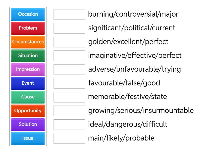 Problem - growing/serious/insurmountable, Opportunity - golden/excellent/perfect, Cause - main/likely/probable, Situation - ideal/dangerous/difficult, Solution - imaginative/effective/perfect, Occasion - memorable/festive/state, Event - significant/political/current, Circumstances - adverse/unfavourable/trying, Issue - burning/controversial/major, Impression - favourable/false/good,