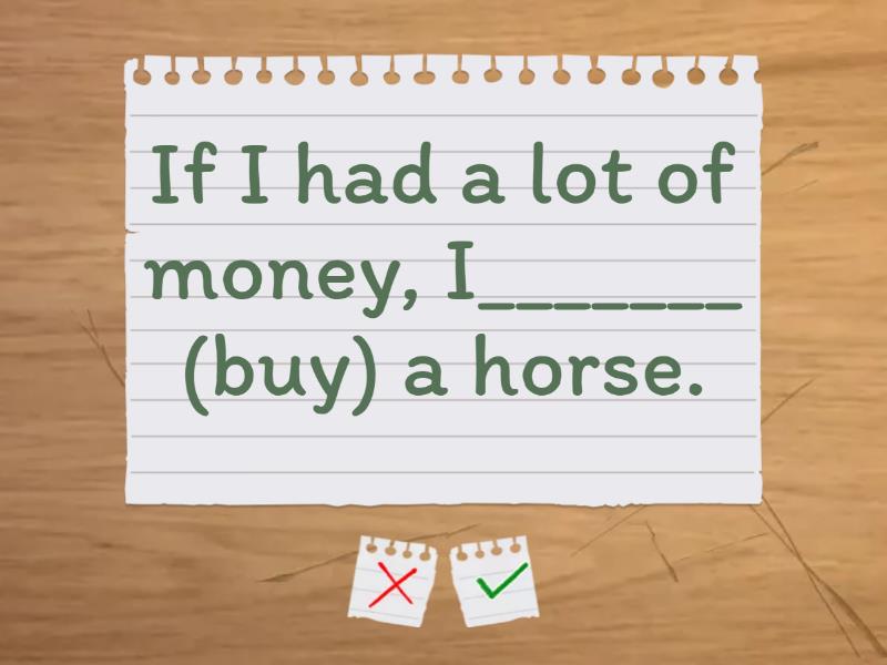 What will we do tomorrow if it ________ (rain)? - rains, If I had a lot of money, I_______ (buy) a horse. - I would buy, She'd pass her exams if she ______ (study) harder. - studied, I'm sure she ________ (lend) you the money if you ask her nicely. - will lend, I'd like your dog more if he ________ (not be) so noisy. - weren't , If I _______ (not see) you this evening, I'll see you on Friday. - don't see, I ________(not say) anything to James if you don't want me to. - won't say, If you _______ (not hurry up), we'll miss the train - don't hurry up, If I were you, I _______(not go) to the UK in winter - wouldn't go, What _______ you _______(do) if you found a snake in your bed? - would you do,