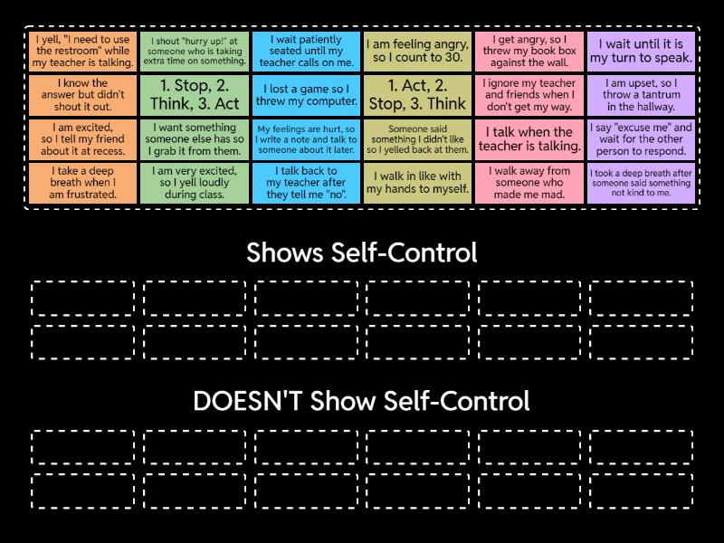 Shows Self-Control: My feelings are hurt, so I write a note and talk to someone about it later., I wait patiently seated until my teacher calls on me., I am feeling angry, so I count to 30., I am excited, so I tell my friend about it at recess., 1. Stop, 2. Think, 3. Act, I know the answer but didn't shout it out., I took a deep breath after someone said something not kind to me., I wait until it is my turn to speak., I walk away from someone who made me mad., I take a deep breath when I am frustrated., I say "excuse me" and wait for the other person to respond., I walk in like with my hands to myself., DOESN'T Show Self-Control: I am very excited, so I yell loudly during class., I get angry, so I threw my book box against the wall., I yell, "I need to use the restroom" while my teacher is talking., I am upset, so I throw a tantrum in the hallway., 1. Act, 2. Stop, 3. Think, Someone said something I didn't like so I yelled back at them., I lost a game so I threw my computer., I want something someone else has so I grab it from them., I ignore my teacher and friends when I don't get my way., I talk when the teacher is talking., I shout "hurry up!" at someone who is taking extra time on something., I talk back to my teacher after they tell me "no".,