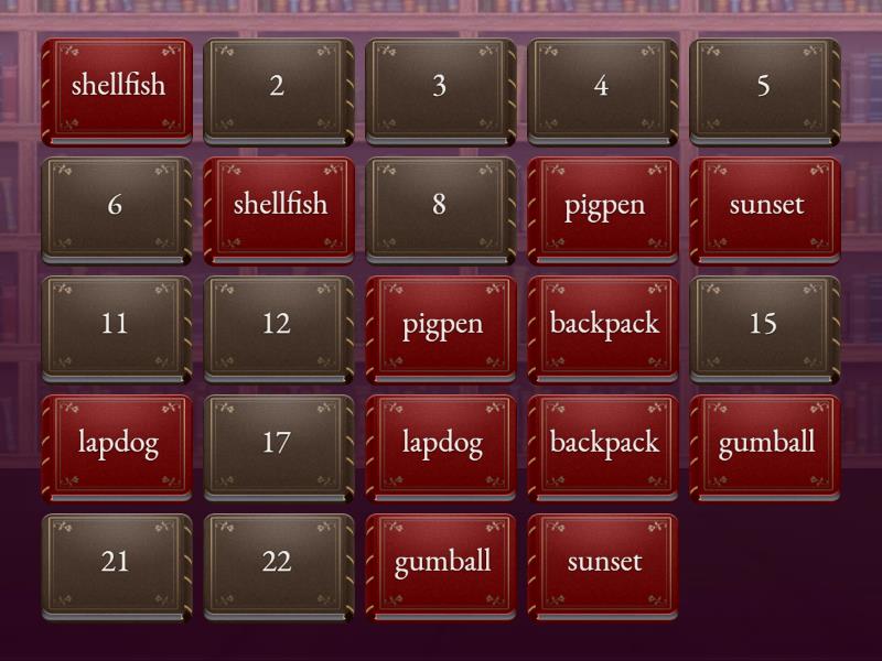 backpack, sunset, gumball, shellfish, lapdog, pigpen, catnap, sunrise, cupcake, campfire, lipstick, sunshine,