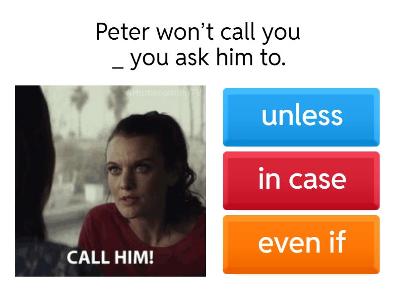 1) Peter won’t call you _ you ask him to. a) unless b) in case c) even if 2) ______ you study hard, your English won't improve. a) unless b) in case c) even if 3) Take the spare key _ I am still out when you get back. a) unless b) in case c) even if 4) Don’t forget to keep the receipt _ you need it later. a) unless b) in case c) even if 5) Mary won't go to the party _______ she gets good marks. a) unless b) in case c) even if 6) _ a fire do not use the lifts. a) unless b) in case c) even if 7) _______ you apologise, he’ll never forgive you. a) unless b) in case c) even if 8) _____ it rains, I will go to the beach. a) unless b) in case c) even if 9) Only members can go in. a) Unless you are a member, you can't go in. b) You can go in even if you are a member. c) You can go in case you are a member. 10) _____ I have money, I won't buy a phone. a) unless b) in case c) even if 11) He will have money to travel _____ he loses his job. a) unless b) in case c) even if 12) We will travel to USA _____ we get a visa. a) unless b) in case c) even if 13) We will not travel to USA _____ we get a visa. a) unless b) in case c) even if 14) _____ she takes a taxi, she'll get there in time. a) unless b) in case c) even if 15) _____ she takes a taxi, she won't get there in time. a) unless b) in case c) even if 16) You will feel cold _____ you wear a coat. a) unless b) in case c) even if 17) You will not feel cold _____ you wear a coat. a) unless b) in case c) even if 18) You can offer as much as you want, I'll never work for you. (Choose the option with similar meaning). a) Unless you offer a lot of money b) In case you offer a lot of money c) Even if you offer a lot of money 19) Maria won’t speak to you _ you apologise for what you did. a) unless b) in case c) even if 20) You should vote ______ you don't know who to vote for. a) unless b) in case c) even if 21) I wouldn't go into the water _______ I could swim. a) unless b) in case c) even if