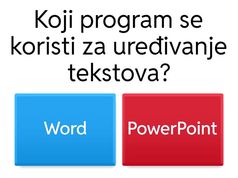 1) Koji program se koristi za uređivanje tekstova? a) Word b) PowerPoint 2) Koja se preglednik dobije uz Windowse? a) Microsoft Edge b) Google Chrome 3) Je li ovo ulazni ili izlazni uređaj? a) ulazni b) izlazni 4) Koja je kratica za procesor? a) CPU b) GPU 5) Koji je najveći proizvođač grafičkih kartica na svijetu? a) NVidia b) AMD 6) Koji od ovih predmeta je hardware računala? a) HDD b) Chrome c) Edge d) Bojanje 3D 7) Koji program prikazuje ovaj logo? a) Google b) Google Chrome 8) Koja od ovih mreža je svjetska računalna mreža? a) LAN b) PAN c) WAN d) MAN 9) Koji od ovih Windowsa je najstariji? a) Windows 10 b) Windows XP c) Windows 7 d) Windows 11 10) Za koju komponentu je ime memorija ili kratica RAM a) b) c) d)