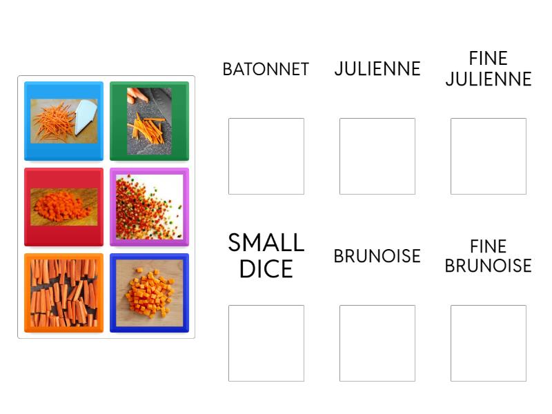 BATONNET: , JULIENNE: , FINE JULIENNE: , SMALL DICE: , BRUNOISE: , FINE BRUNOISE: ,