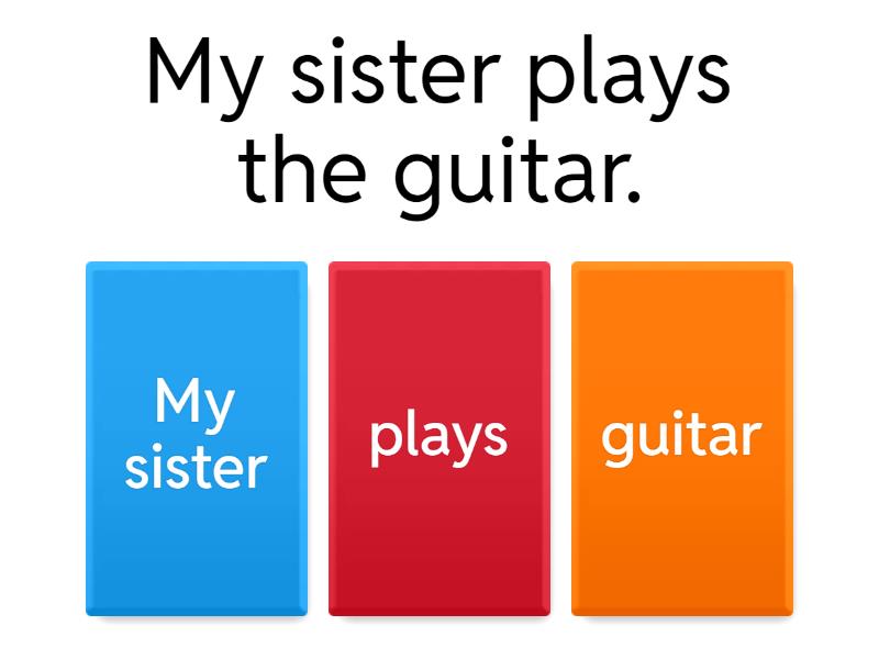 1) My sister plays the guitar. a) My sister b) plays c) guitar 2) My mom makes delicious chocolate cake. a) My mom b) chocolate cake c) makes d) delicious 3) The teacher reads a book. a) reads b) teacher c) a book 4) The students write their answers on the whiteboard. a) whiteboard  b) students c) write d) answers 5) Carlos rides his bike everyday. a) bike b) rides c) everyday d) Carlos 6) Maria smells the yellow flowers. a) yellow b) smells c) Maria d) flowers 7) Jasmin and Peter finished dinner. a) Jasmin and Peter b) dinner c) finished 8) The dog chased the cat. a) chased b) dog c) cat 9) My father makes breakfast every morning. a) father b) makes c) morning d) breakfast 10) Mr. Jones drove his car to work. a) drove b) Mr. Jones c) car d) work 11) Paul gave some money to Eva. a) Eva b) money c) Paul d) gave 12) The cat drank some water . a) cat b) water c) drank d) some 13) He bought flowers for Sylvia. a) bought b) flowers c) Sylvia d) He 14) She gave some cookies to her son.  a) She b) her son c) cookies d) gave 15) I sent a card to Nick. a) a card b) Nick c) sent d) I
