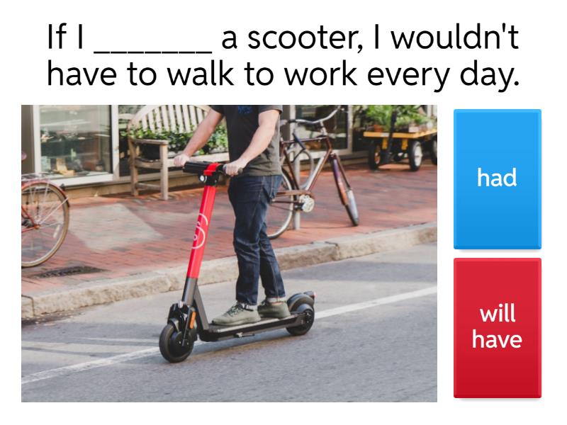 1) If I _______ a scooter, I wouldn't have to walk to work every day.   a) had b) will have 2) If I won the lottery, I __________ a big house on the ocean. a) buy b) would buy 3) What would you do if you _______ a wallet in the street? a) found b) will find 4) I ______ forgive Sophie if I were you. a) would b) won't c) will 5) If I wasn't busy, I _______ to Brenda´s party. a) would go b) will go 6) If I were you, I _________ Kevin the truth.  a) will tell b) would tell 7) What would you do if you ________ a poisonous snake? a) see b) saw 8) If I ___________ time, I would help you.  a) will have b) had 9) If I ________ in English class now, I would be outside in the park. a) wasn´t b) weren´t