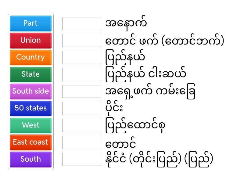 Union - ပြည်ထောင်စု, West - အနောက်, Side - ဖက် (ဘက်), Coast - ကမ်းခြေ, North - မြောက်, Country - နိုင်ငံ (တိုင်းပြည်) (ပြည်), South - တောင်, Between - အကြား (ကြား), Part - ပိုင်း, East - အရှေ့, State - ပြည်နယ်, 50 states - ပြည်နယ် ငါးဆယ်, Mid west - အနောက် အလယ် , South side - တောင် ဖက် (တောင်ဘက်), West coast - အနောက်ဖက် ကမ်းခြေ, East coast - အရှေ့ဖက် ကမ်းခြေ, Washington state - ဝေါ် ရှင်တန် ပြည်နယ်,