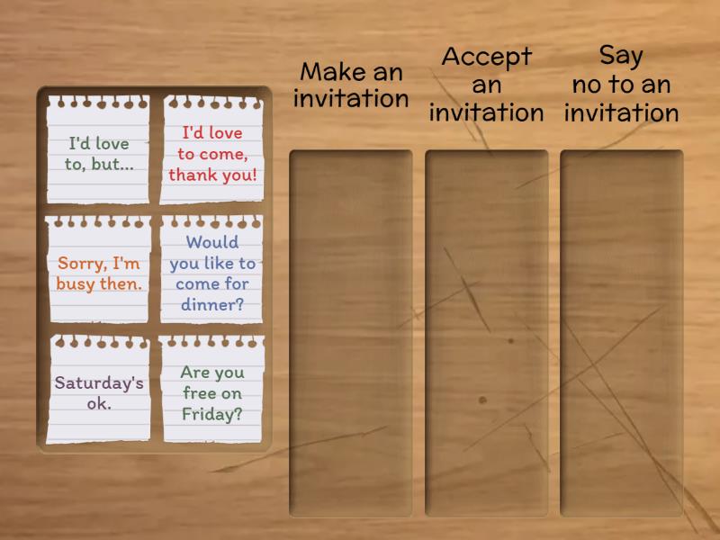 Make an invitation: Would you like to come for dinner?, Are you free on Friday?, Accept an invitation: I'd love to come, thank you!, Saturday's ok., Say no to an invitation: I'd love to, but..., Sorry, I'm busy then.,