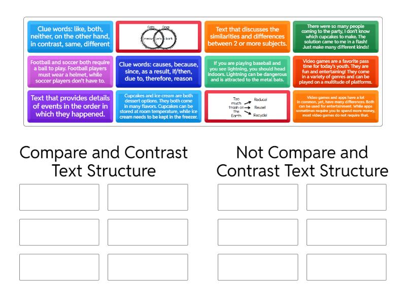 Compare and Contrast Text Structure: Text that discusses the similarities and differences between 2 or more subjects., Clue words: like, both, neither, on the other hand, in contrast, same, different, , Video games and apps have a lot in common, yet, have many differences. Both can be used for entertainment. While apps sometimes require you to spend more money, most video games do not require that., Cupcakes and ice cream are both dessert options. They both come in many flavors. Cupcakes can be stored at room temperature, while ice cream needs to be kept in the freezer., Football and soccer both require a ball to play. Football players must wear a helmet, while soccer players don't have to., Not Compare and Contrast Text Structure: Text that provides details of events in the order in which they happened., Clue words: causes, because, since, as a result, if/then, due to, therefore, reason, , Video games are a favorite pass time for today's youth. They are fun and entertaining! They come in a variety of genres and can be played on a multitude of platforms., There were so many people coming to the party, I don't know which cupcakes to make. The solution came to me in a flash! Just make many different kinds!, If you are playing baseball and you see lightning, you should head indoors. Lightning can be dangerous and is attracted to the metal bats.,