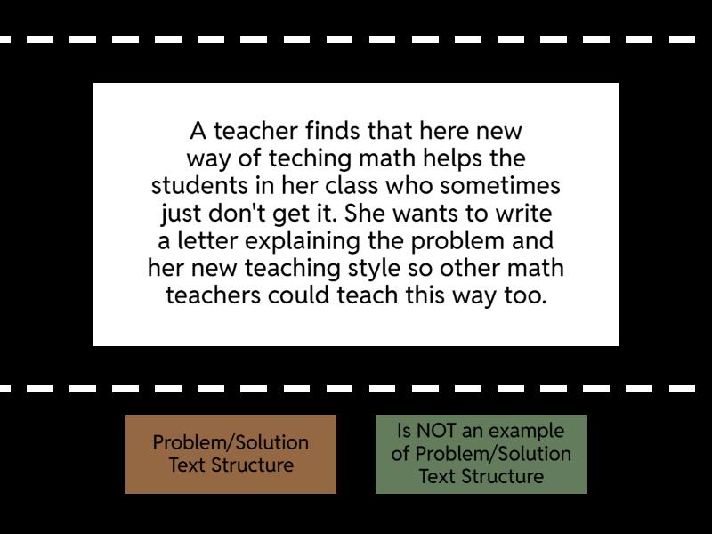 Problem/Solution Text Structure: A teacher finds that here new way of teching math helps the students in her class who sometimes just don't get it. She wants to write a letter explaining the problem and her new teaching style so other math teachers could teach this way too., Wild chimpanzees are rapidly disappearing. Some people are trying to solve this problem. Other wise, chimpanzees may one day exist only in zoos. People are trying to save the rainforests and woodlands where the chimps live from being cut down. It will take many people working together to solve this problem., Text that provides information about an issue and ways to fix it, Clue words: solve, dilemma, problem, solution, question, answer, Are you playing too many video games? Get out there and try something new! Maybe a sport, a club, or even a new hobby could help you walk away from that system!, , Is NOT an example of Problem/Solution Text Structure: A scientist finds skeleton bones that are very similar to T-Rex and wants to write a report about how the new set of bones compares to that of a T-Rex., In Spanish class, the teacher assigns you homework. You must write a report in Spanish on how to make a peanut butter and jelly sandwich., You want your mom to buy your favorite kind of shoes at the store, but you can't go with her to pick them out. you must write down everything she needs to know in order to pick out the right shoes for you., A chimpanzee's body is made for climbing and swinging in the trees. First, it uses its long arms to reach a branck. Finally, it swings from that branch to another branch of the tree., Text that discusses how things are the same and different, Clue words: adjectives, characteristics, for example, for instance,