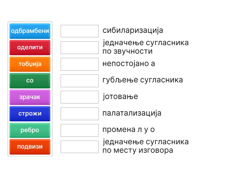 тобџија - једначење сугласника по звучности, со - промена л у о, строжи - јотовање, подвизи - сибиларизација, зрачак - палатализација, ребро - непостојано а, одбрамбени - једначење сугласника по месту изговора, оделити - губљење сугласника,