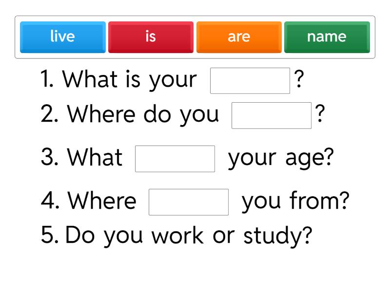 1. What is your ____? 2. Where do you ____? 3. What ____ your age? 4. Where ____ you from? 5. Do you work or study? 1. What are your ____ ? 2. What is your ____ food ? 3. What colour do you ____ best? 4. What is your favorite animal? And why? 5. Tell me about your family.