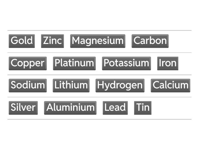 Potassium Sodium Lithium Calcium Magnesium Aluminium Carbon Zinc Iron Tin Lead Hydrogen Copper Silver Gold Platinum,