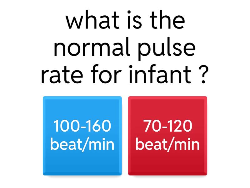 1) what is the normal pulse rate for infant ? a) 100-160 beat/min b) 70-120 beat/min 2) what is the normal respiration rate for adult? a) 12-20 breaths/min b) 30-60 breaths/min