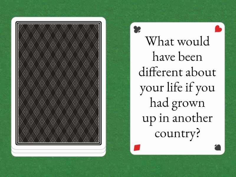 What would have been different about your life if you had grown up in another country?, How would your life have been different if you had been born a girl/boy?, What would you have done if you had been the leader of the country during WW2?, What would you have done last week if you’d had more time? Why?.