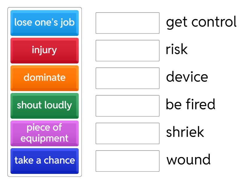 lose one’s job - be fired, shout loudly - shriek, take a chance - risk , dominate - get control, injury - wound, piece of equipment - device,