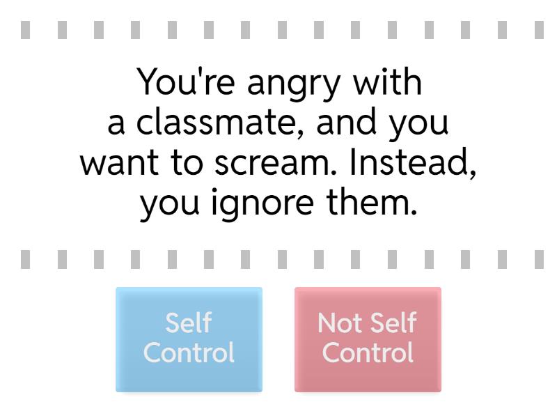 Self Control: You're angry with a classmate, and you want to scream. Instead, you ignore them. , Your teacher is talking about something you are not interested in, but you keep listening because it could be important., Your teacher is away and you have a sub. Some of your classmates are being silly. You ignore them and listen to the teacher. , A classmate starts calling you names, and you ignore them. , You feel like running through the halls, but you calm yourself down and walk the right way. , You come in from lunch and are really hyper but you sit down and get to work calmly anyways. , Not Self Control: You are frustrated with a classmate You tell them that they are stupid and they need to go away. , A classmate keeps making silly noises to distract the teacher. You join them, You are bored in class and you start using your pencils as drumsticks, distracting everyone else around you. , Your teacher is explaining something to , A classmate is calling you names, and you start calling names back. You both get in trouble for disrupting the class. , Your friend yells at you from across the lunchroom, you stand up and yell back. ,