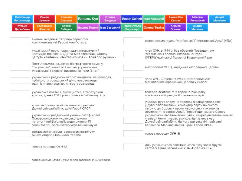 Іван Багряний - Поет ,письменник, автор біографічного роману "Тигролови", член ОУН, ініціатор утворення Української Головної Визвольної Рали (УГВР), Тарас Бульба (Боровець) - діяч українського повстанського руху часів Другої світової війни, засновник УПА «Поліська Січ», Степан Бандера - голова проводу ОУН -Б, Ярослав Стецько - член ОУН, 30 червня 1941 р. проголосив Акт відновлення Української Дерави у Львові, Андрій Мельник - голова проводу ОУН-М, Роман Шухевич - головнокомандувач Української Повстанської Армії (УПА), Кирило Осьмак - член ОУН, в 1944 р. був обраний Президентом Української Головної Визвольної Ради (УГВР)Української Головної Визвольної Рали, Іван Кожедуб - український льотчик-винищувач, найрезультативніший ас у авіації Антигітлерівської коаліції за весь час Другої світової війни. На його рахунку 64 повітряні перемоги. Маршал авіації. Тричі Герой СРСР., Ахмет-Хан Султан - кримськотатарський льотчик-ас, учасник Другої світової війни, двічі Герой СРСР, Василь Порик - учасник руху опору на теренах Франції упродовж Другої світової війни, командир партизанського загону, що боровся проти нацистських окупантів, лейтенант Червоної Армії, Герой Радянського Союзу, Кузьма Дерев'янко - генерал-лейтенант. 2 вересня 1945 року приймав капітуляцію Японської імперії., Олена Теліга - українська поетеса, публіцистка, літературний критик, діячка ОУН, розстріляна в Бабиному Яру, Василь Кук - головнокомандувач УПА після загибелі Р. Шухевича, Олександр Богомолець - український радянський учений-патофізіолог. Основоположник української школи патологічної фізіології, ендокринології і геронтології, організатор української науки, Сергій Лебедєв - вчений, академік, творець першого в континентальній Європі комп'ютера., Андрій Малишко - український поет, перекладач, літературний критик,автор пісень «Де ти, моя стежино», «Знову цвітуть каштани», «Вчителько моя», «Пісня про рушник», Максим Рильський - український радянський поет-академік, перекладач, публіцист, громадський діяч, мовознавець, один із «неокласиків», літературознавець, Володимир Філатов - офтальмолог, хірург, засновник Інституту очних хвороб і тканинної терапії, Йосип Сліпий - митрополит УГКЦ, кардинал католицької церкви;,