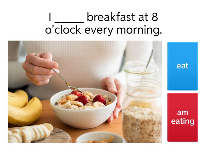 1) I _____ breakfast at 8 o’clock every morning. a) eat b) am eating 2) She ______ the piano every day. a) playing b) plays 3) We _____ to school by bus on Mondays. a) go b) are going 4) He _______ coffee in the morning. a) is drinking b) drinks 5) They _____ books in the evening. a) are reading b) read 6) I ______ lunch now. a) eating b) am eating 7) She _______ a book at the park at the moment. a) is reading b) reads 8) We ________ TV now. a) watch b) are watching 9) He _________ a letter at the moment. a) writes b) is writing 10) They __________ football right now. a) am playing b) are playing
