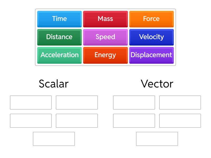 Scalar: Mass, Distance, Speed, Energy, Time, Vector: Acceleration, Velocity, Displacement, Force,