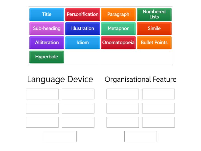 Language Device: Metaphor, Simile, Onomatopoeia, Personification, Alliteration, Hyperbole, Idiom, Organisational Feature: Paragraph, Bullet Points, Title, Sub-heading, Illustration, Numbered Lists,