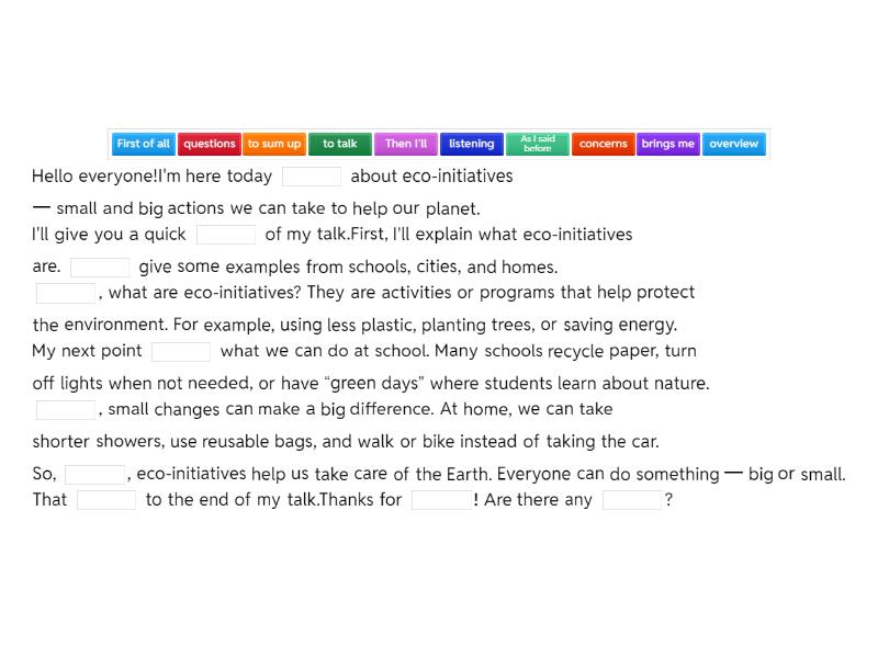 Hello everyone!I'm here today ____ about eco-initiatives — small and big actions we can take to help our planet. I'll give you a quick ____ of my talk.First, I’ll explain what eco-initiatives are. ____ give some examples from schools, cities, and homes. ____, what are eco-initiatives? They are activities or programs that help protect the environment. For example, using less plastic, planting trees, or saving energy. My next point ____ what we can do at school. Many schools recycle paper, turn off lights when not needed, or have “green days” where students learn about nature. ____, small changes can make a big difference. At home, we can take shorter showers, use reusable bags, and walk or bike instead of taking the car. So, ____, eco-initiatives help us take care of the Earth. Everyone can do something — big or small. That ____ to the end of my talk.Thanks for ____! Are there any ____?