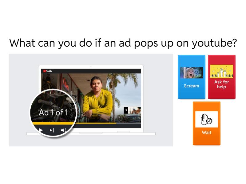 1) What can you do if an ad pops up on youtube? a) Scream b) Ask for help c) Wait 2) What you do if you say "mama mama" and she does not respond? a) Say excuse me mom and wait quietly for her to become available b) Continue saying "mama" c) Scream 3) What can you do if you want to play connect four and the other person says "not now"? a) Scream b) Take a deep breath, say okay c) Cry 4) What can you do when someone tells you to "wait" a) Wait and use squeezing ball b) Scream c) Keep calling their name 5) What do you do when someone says "too loud"? a) Scream b) Lower my volume c) Say "No" 6) What can I do if I want to change the youtube video? a) Ask for help using inside voice b) Scream c) Cry 7) What can you do when the door is open? a) Close the door gently b) Slam the door c) Scream 8) What do yo do when the bell rings? a) Wait quietly for mom to answer b) Scream c) See who is at the door 9) What do you do when you hear a ring in the youtube video? a) Scream b) Listen quietly  c) Laugh loudly
