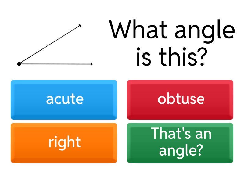 1) What angle is this? a) acute b) obtuse c) right d) That's an angle? 2) What angle is this? a) acute b) obtuse c) That is not an angle, that is n L. d) right 3) What angle is this? a) acute b) obtuse c) right d) straight 4) How many degrees is a right angle? a) 20 º b) 180 º c) 50 º d) 90 º 5) Which degree could be for an acute angle? a) 99 º b) 180 º c) 100 º d) 20 º 6) Which degree could be for an obtuse angle? a) 20 º b) 45 º c) 120 º d) 180 º
