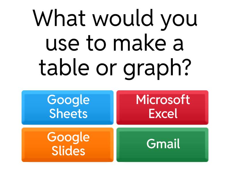 1) What would you use to make a table or graph? a) Google Sheets b) Microsoft Excel c) Google Slides d) Gmail 2) What would you use to send an email? a) Google Docs b) Gmail c) Outlook d) Internet Explorer 3) What would you use to make a presentation? a) Google Docs b) Microsoft Word c) Microsoft Powerpoint d) Google Slides 4) What would you use to write a document? a) Google Drive b) Microsoft Word c) Microsoft Powerpoint d) Google Docs 5) What can you use to organize files? a) Google Drive b) One Drive c) Internet Explorer d) Google Docs
