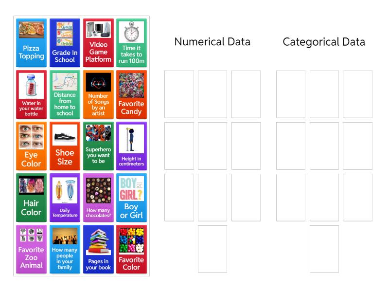 Numerical Data: Height in centimeters, Number of Songs by an artist, How many people in your family, Time it takes to run 100m, Distance from home to school, How many chocolates?, Daily Temperature, Water in your water bottle, Pages in your book, Shoe Size, Categorical Data: Favorite Color, Favorite Zoo Animal, Boy or Girl, Superhero you want to be, Hair Color, Eye Color, Pizza Topping, Favorite Candy , Grade In School , Video Game Platform,