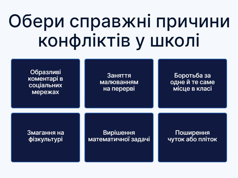 1) Обери справжні причини конфліктів у школі a) Образливі коментарі в соціальних мережах b) Заняття малюванням на перерві c) Боротьба за одне й те саме місце в класі d) Змагання на фізкультурі e) Вирішення математичної задачі f) Поширення чуток або пліток 2) Обери справжні причини конфліктів у школі a) Гра з повітряним змієм разом з іншими b) Насмішки або зневажливе ставлення c) Суперечки під час гри на перерві d) Спільний обід у шкільній їдальні e) Відібрання телефона без дозволу f) Глузування з зовнішнього вигляду однокласника