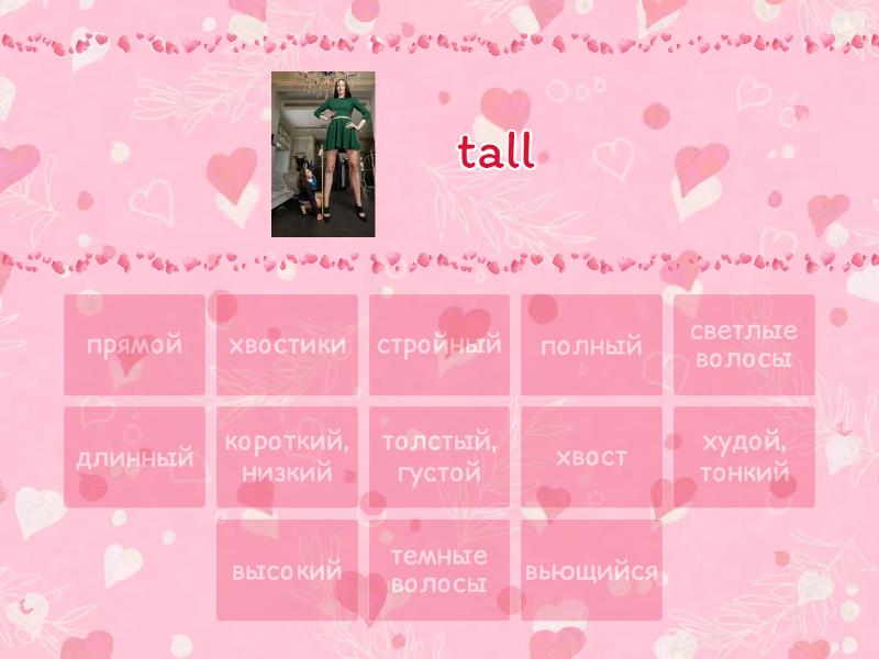 высокий - tall, короткий, низкий - short, длинный - long, вьющийся - curly, прямой - straight, стройный - slim, полный - plump, толстый, густой - thick, худой, тонкий - thin, светлые волосы - fair hair, темные волосы - dark hair, хвостики - pigtails, хвост,