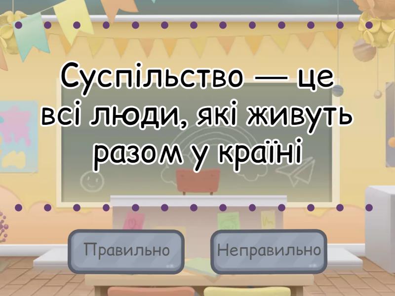 Правильно: Суспільство — це всі люди, які живуть разом у країні, Громадянське суспільство створюють активні громадяни, Громадські об'єднання є частиною громадянського суспільства, Держава має власну територію та населення, Податки є ознакою існування держави, Основна функція держави — захищати права громадян, Освіта і медицина — це приклади внутрішніх функцій держави, Участь у міжнародних організаціях належить до зовнішніх функцій держави, Екологічна функція держави полягає в охороні довкілля, Унітарна держава має одну централізовану владу, Демократичний режим передбачає свободи та вибори, Президент України підписує укази про надання громадянства, Неправильно: Громадянське суспільство — це лише державні чиновники, Держава і громадянське суспільство — це одне і те саме, Суверенітет означає залежність держави від інших країн, Неосновні функції держави зовсім не важливі, Економічні функції держави пов’язані із захистом природи, Федерація — це коли всі рішення ухвалюють тільки в центрі, У тоталітарній державі є багато політичних партій і свободи слова, Громадянство України можна отримати тільки через імміграцію,