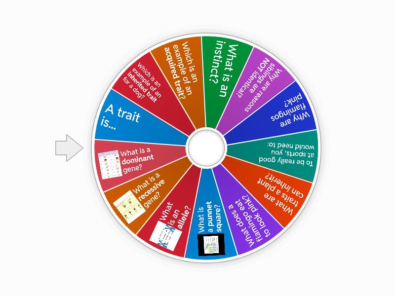 1) A trait is... a) a characteristic of a living thing b) Being identical to your parents 2) Which is an example of an inherited trait for a dog? a) Where they live b) The tricks they learn c) the color of their fur 3) Which is an example of an acquired trait? a) having blue eyes b) having brown hair c) speaking Spanish 4) What is an instinct? a) a learned behavior b) an inherited behavior c) a type of gene 5) Why are reasons siblings are NOT identical? a) They inherit different traits from their parents b) The acquire different traits from things they learn 6) Why are flamingos pink? a) It is an inherited trait b) it is an acquired trait c) It is an environmental trait 7) To be really good at sports, you would need to: a) inherit that trait b) acquire that trait 8) What are traits a plant can inherit? a) roots, odor, size, shape b) broken stems, dying leaves 9) What does a flamingo eat to look pink? a) shrimp b) algae 10) What is a punnet square? a) A chart that shows all of the possible combinations of alleles b) A chart that shows acquired traits 11) What is an allele?  a) different versions of the same plant b) different versions of the same gene 12) What is a recessive gene? a) an allele that is masked when a dominant allele is present b) a gene is altered 13) What is a dominant gene?   a) A trait that dominates, or covers over, another form of that trait b) a gene that doesn't show