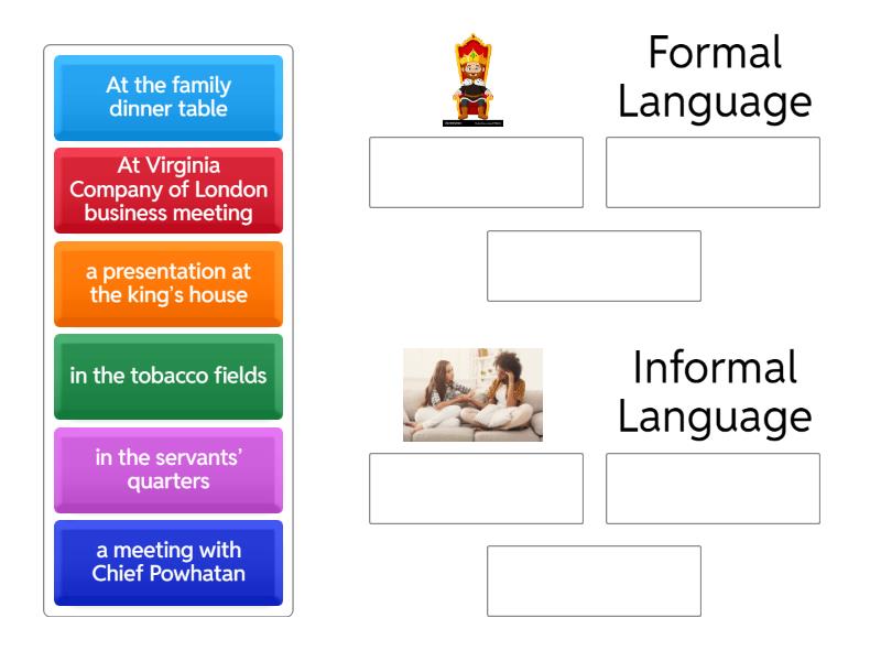 Formal Language: a meeting with Chief Powhatan, a presentation at the king’s house, At Virginia Company of London business meeting, Informal Language: in the servants’ quarters, in the tobacco fields, At the family dinner table,