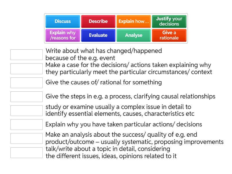 Explain why /reasons for - Give the causes of/ rational for something, Explain how… - Give the steps in e.g. a process, clarifying causal relationships, Discuss - talk/write about a topic in detail, considering the different issues, ideas, opinions related to it , Analyse - study or examine usually a complex issue in detail to identify essential elements, causes, characteristics etc, Give a rationale - Explain why you have taken particular actions/ decisions, Justify your decisions - Make a case for the decisions/ actions taken explaining why they particularly meet the particular circumstances/ context, Describe - Write about what has changed/happened because of the e.g. event, Evaluate - Make an analysis about the success/ quality of e.g. end product/outcome – usually systematic, proposing improvements,