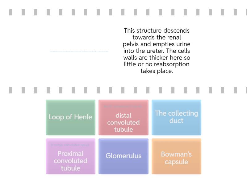 The collecting duct - This structure descends towards the renal pelvis and empties urine into the ureter. The cells walls are thicker here so little or no reabsorption takes place., distal convoluted tubule - The absorption of many ions including sodium, chloride and calcium takes place here, Bowman's capsule  - A cup-like sack at the beginning of a nephron that performs the first step in the filtration of blood to form urine. A glomerulus is enclosed in the sac., Loop of Henle - Reabsorb water and sodium chloride from the filtrate. This conserves water for the organism, producing highly concentrated urine., Proximal convoluted tubule - Where water, glucose, amino acids and other substances are reabsorbed back into the bloodstream, Glomerulus - A knot of blood vessels. lets fluid and waste products pass through it; however, it prevents blood cells and large molecules, mostly proteins, from passing. This is where Ultrafiltration takes placeThis is where Ultrafiltration takes place,