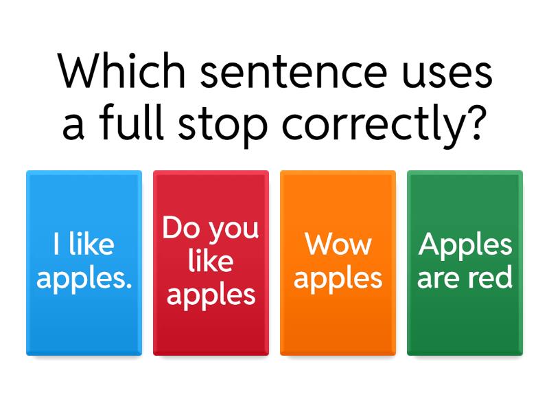1) Which sentence uses a full stop correctly? a) I like apples. b) Do you like apples c) Wow apples d) Apples are red 2) Identify the correct use of a capital letter. a) i went home. b) She is here. c) they are late. d) we saw a cat. 3) Which sentence uses an exclamation mark correctly? a) What a day! b) I am happy. c) Where are you d) She is here 4) Identify the correct use of a question mark. a) Are you coming? b) He is here. c) What a surprise! d) I am late 5) Which sentence uses commas correctly? a) I bought apples, oranges and bananas. b) I like apples oranges and bananas. c) I like, apples oranges and bananas. d) I bought, apples oranges, and bananas. 6) Identify the correct use of brackets. a) He won the race (again). b) He won the race again. c) He (won) the race again. d) He (won the race) again. 7) Which sentence uses a colon correctly? a) She needs: milk, eggs and bread. b) She needs milk: eggs, and bread. c) She needs milk, eggs: and bread. d) She needs milk, eggs, and: bread. 8) Identify the correct use of a full stop. a) He is tall. b) He is tall c) He is tall! d) He is tall? 9) Which sentence uses capital letters correctly? a) She is from France. b) she is from france. c) She is from france. d) she is from France. 10) Identify the correct use of an exclamation mark. a) Wow, that's amazing! b) Wow, that's amazing. c) Wow that's amazing d) Wow that's amazing?