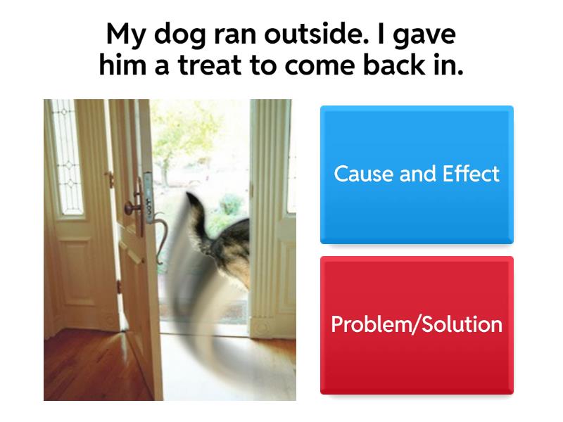1) My dog ran outside. I gave him a treat to come back in. a) Cause and Effect b) Problem/Solution 2) "How Tornadoes are Formed and the Effects They Have on the Earth" a) Cause and Effect b) Problem/Solution 3) I spilled my milk. I had to use paper towels to clean it up. a) Cause and Effect b) Problem/Solution 4) Text that tells a problem and how to solve it a) Cause and Effect b) Problem/Solution 5) Since it is windy, we can fly kites. a) Cause and Effect b) Problem/Solution 6) It was a big issue when I broke my friends toy, but I figured out how to fix it. a) Cause and Effect b) Problem/Solution 7) There was a hole in the boat so it filled with water. a) Cause and Effect b) Problem/Solution 8) Because my dad forgot to put gas in the car, it stopped running. a) Cause and Effect b) Problem/Solution 9) Text that tells what happened and why it happened a) Cause and Effect b) Problem/Solution 10) I forgot my library book in the car. I can solve it by bringing it tomorrow. a) Cause and Effect b) Problem/Solution 11) Clue words: causes, because, since, as a result, if/then, due to, therefore, reason a) Cause and Effect b) Problem/Solution 12) Clue words: solve, issue, problem, fix, resolve, figure out a) Cause and Effect b) Problem/Solution