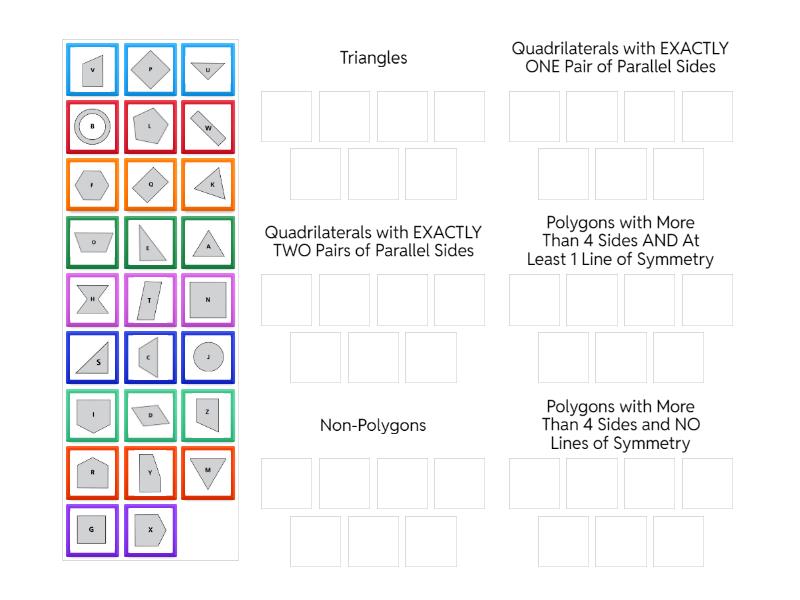 Triangles: , , , , , , Quadrilaterals with EXACTLY ONE Pair of Parallel Sides: , , , , Quadrilaterals with EXACTLY TWO Pairs of Parallel Sides: , , , , , , , Polygons with More Than 4 Sides AND At Least 1 Line of Symmetry: , , , , , , Non-Polygons: , , Polygons with More Than 4 Sides and NO Lines of Symmetry: ,