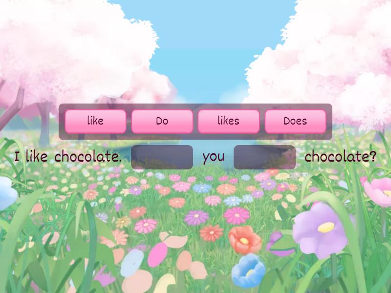 I like chocolate. ____ you ____ chocolate? She lives in Poland. ____ he ____ in Poland too? They study English every Friday. ____ you ____ on Fridays too? She ____ not eat meat. Do you ____ meat? We go to the gym on Mondays. ____ he ____ to the gym too? They ____ not like lettuce. Do you ____ it? I ____ not understand. Do you ____? She does not ____ by bus. ____ he come by bus? They ____ not like their teacher. Do you ____ your teacher? He ____ school at 5 o'clock. ____ she finish at 5 o'clock too?